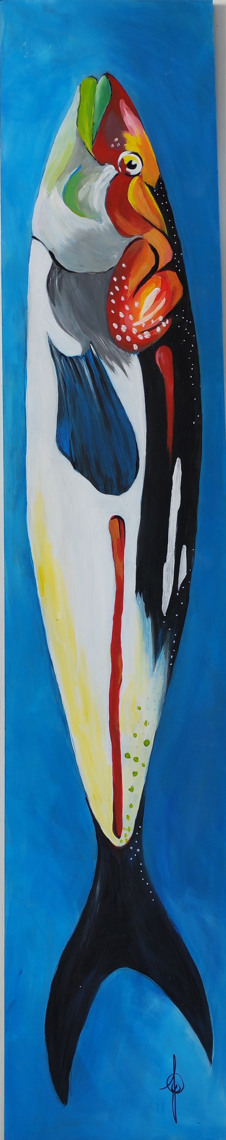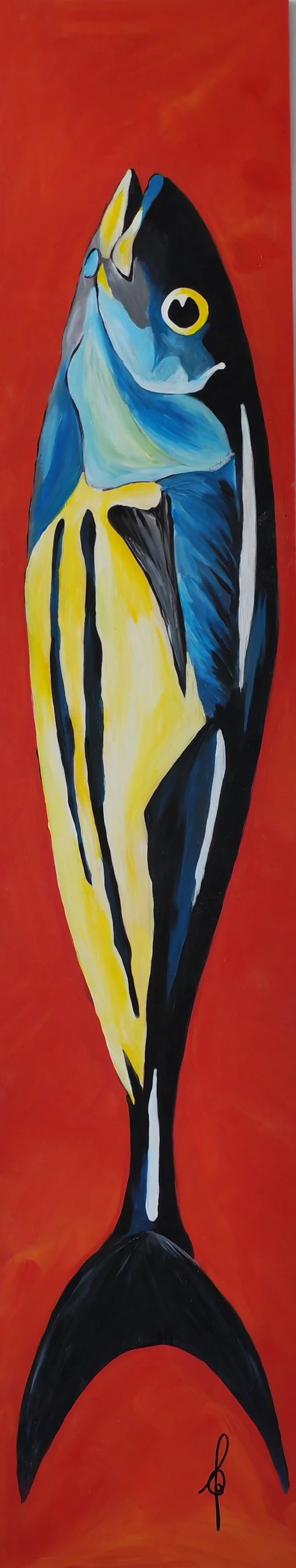 poisson bleu sur fond rouge grand format allongé